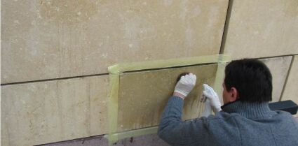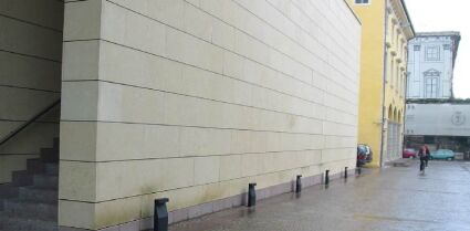 E' stato eseguito un lavaggio sgrassante delicato del rivestimento esterno in pietra con CB90, per rimuovere sporco e polvere e successivamente è stato applicato un trattamento di protezione antigraffiti con GRAFFI FOND e GRAFFI DEFEND.