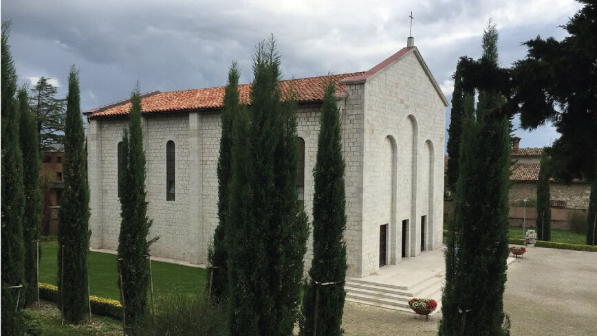 La struttura, severa e austera, è in stile neoromanico, realizzata con blocchi di pietra locale squadrata ed è inserito in un giardino dove sono presenti 40 cipressi che simboleggiano le vittime dell'eccidio.